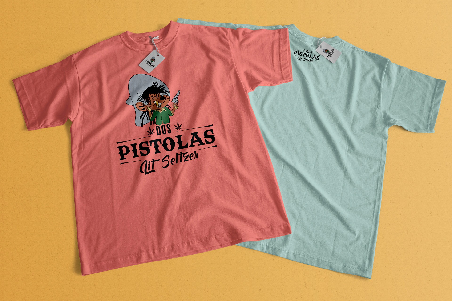 The final identity for Dos Pistolas Lit Seltzer features a unique blend of Mexican and Western styles, with pastel colors and a playful logo, making the brand stand out in the cannabis beverage market.