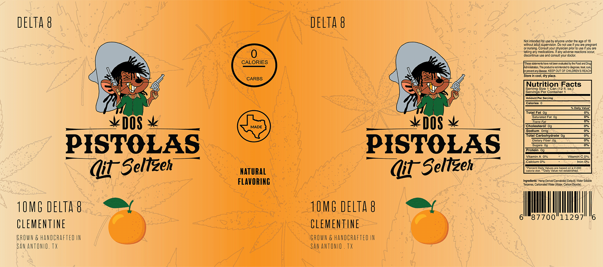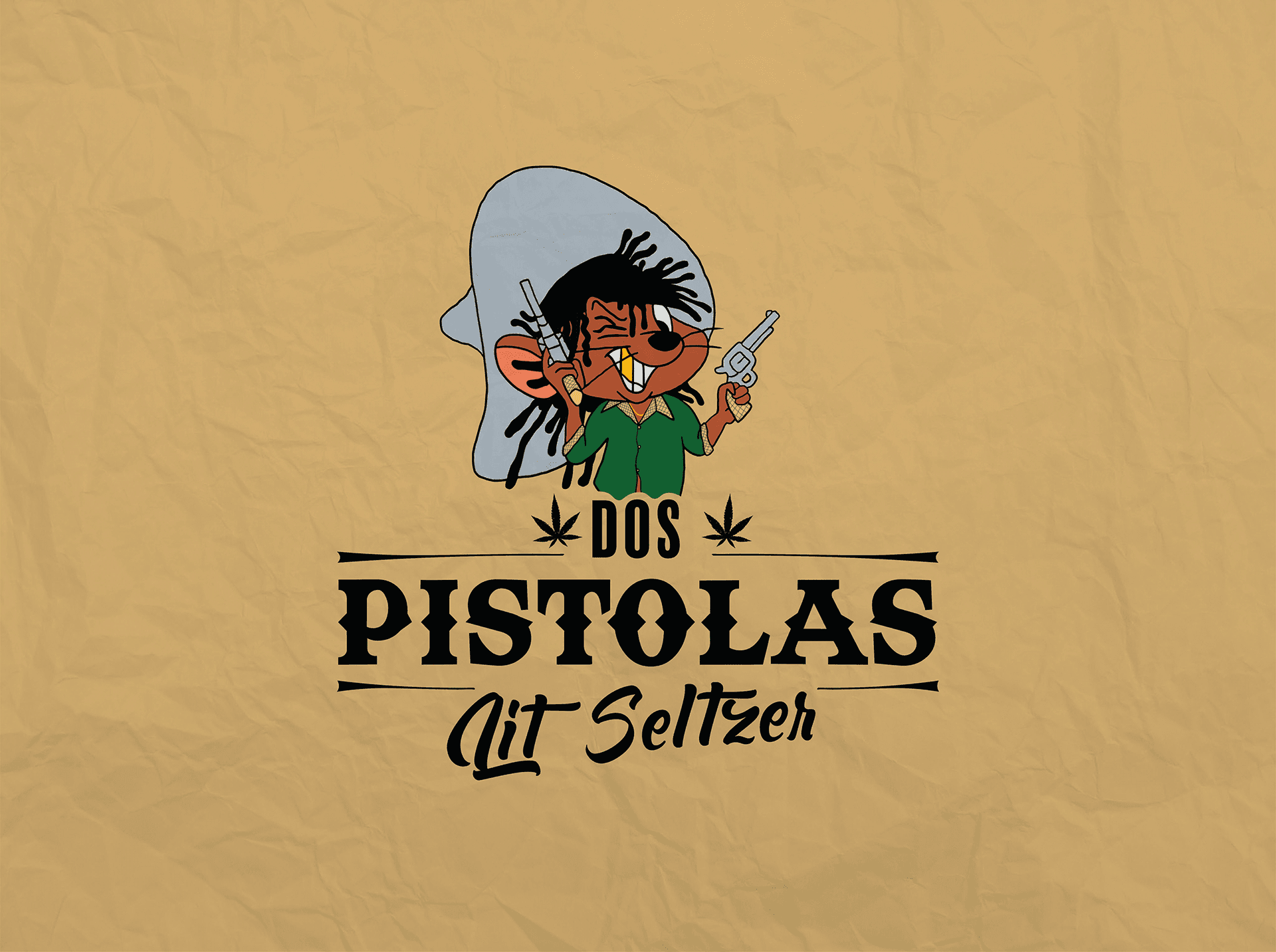 We created playful branding for Dos Pistolas Lit Seltzer, a zero-calorie cannabis-infused drink, featuring a cartoon-inspired logo, pastel colors, and Mexican-Western typography.