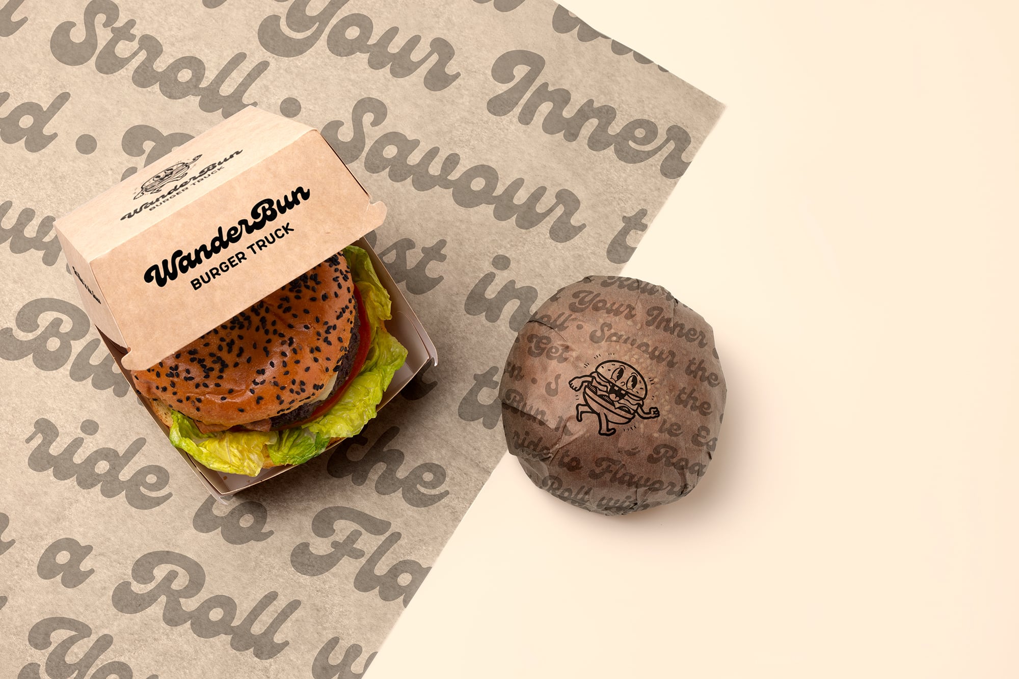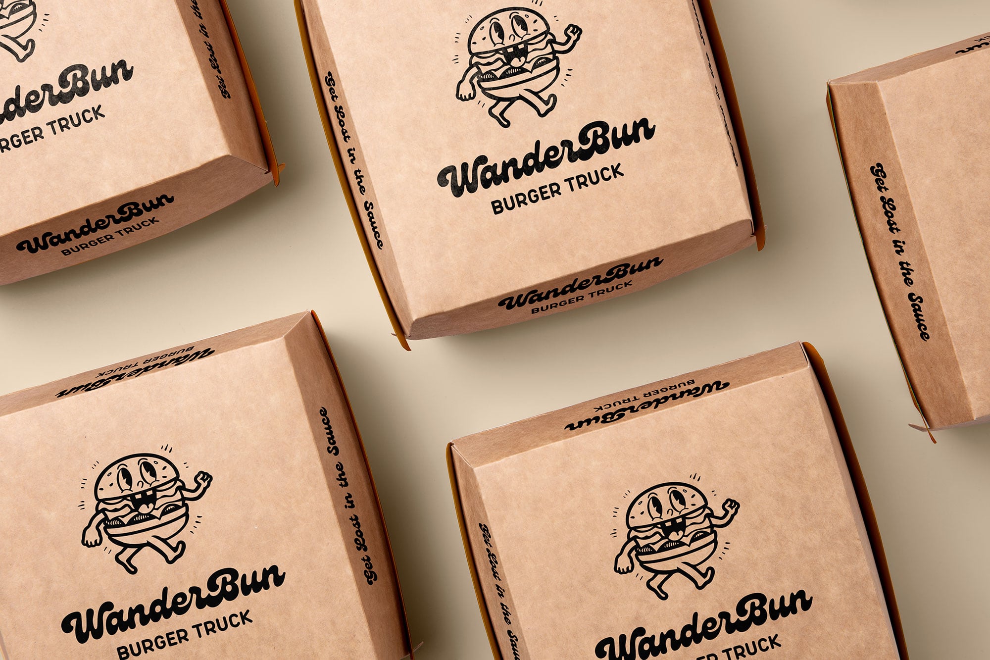 We crafted a vibrant brand identity for WanderBun Burger Truck, integrating sustainability and exploration across logo, menu, and eco-friendly packaging.